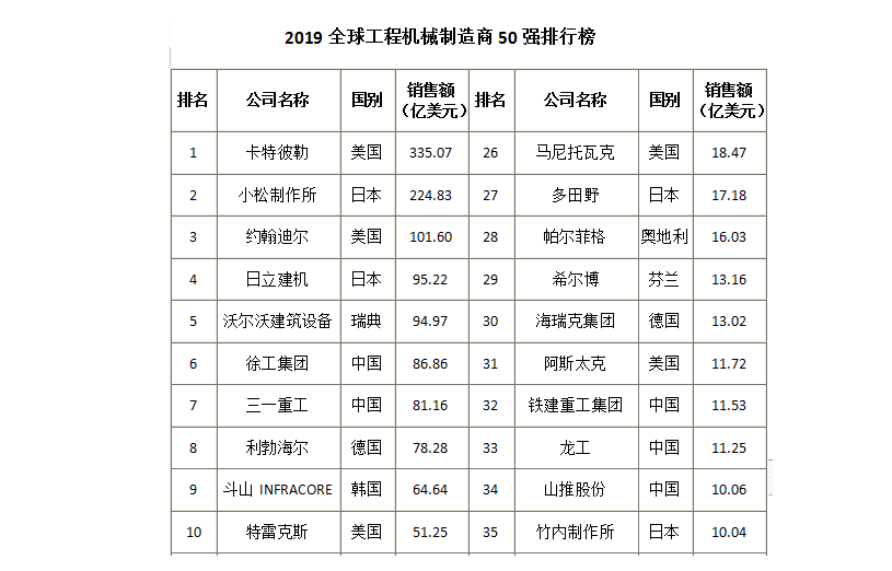 會議期間,組委會發(fā)布了在業(yè)內(nèi)極具公信力和影響力的“2019全球工程機械制造商50強、100強”、“2019中國工程機械產(chǎn)業(yè)影響力100人”、“2019全球起重機制造商10強”、“2019全球、中國塔式起重機制造商10強”、“2019全球、中國高空作業(yè)設(shè)備制造商10強”、“2019全球礦山設(shè)備制造商10強”、“2019中國工程機械代理商10強”等多個榜單??ㄌ乇死兆鳛槿蚬こ虣C械的領(lǐng)頭羊繼續(xù)榮登榜首。