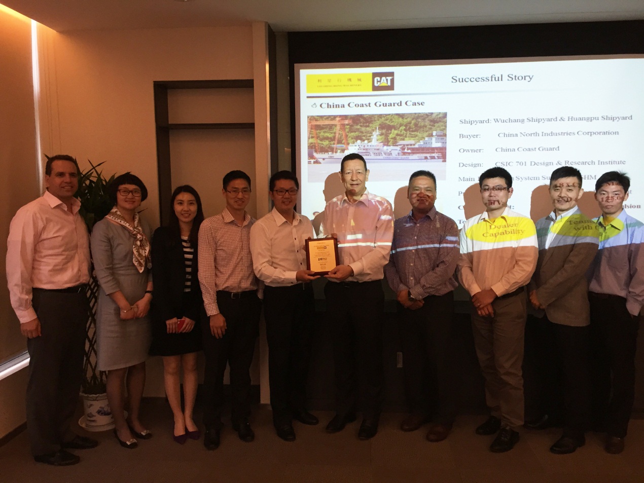 2015年5月26日,卡特彼勒船舶部董事總經(jīng)理Nigel Parkinson及亞太區(qū)銷(xiāo)售經(jīng)理陳耀明先生帶領(lǐng)其團(tuán)隊(duì)成員到訪利星行機(jī)械發(fā)動(dòng)機(jī)事業(yè)部。為了表彰利星行機(jī)械船機(jī)組在中國(guó)政府船市場(chǎng)中取得如此傲人的佳績(jī),Nigel Parkinson先生向利星行機(jī)械船機(jī)組銷(xiāo)售總經(jīng)理洪波先生頒發(fā)了榮譽(yù)獎(jiǎng)牌,并對(duì)該項(xiàng)目團(tuán)隊(duì)成員做出的貢獻(xiàn)與努力給予了高度的評(píng)價(jià)和肯定。